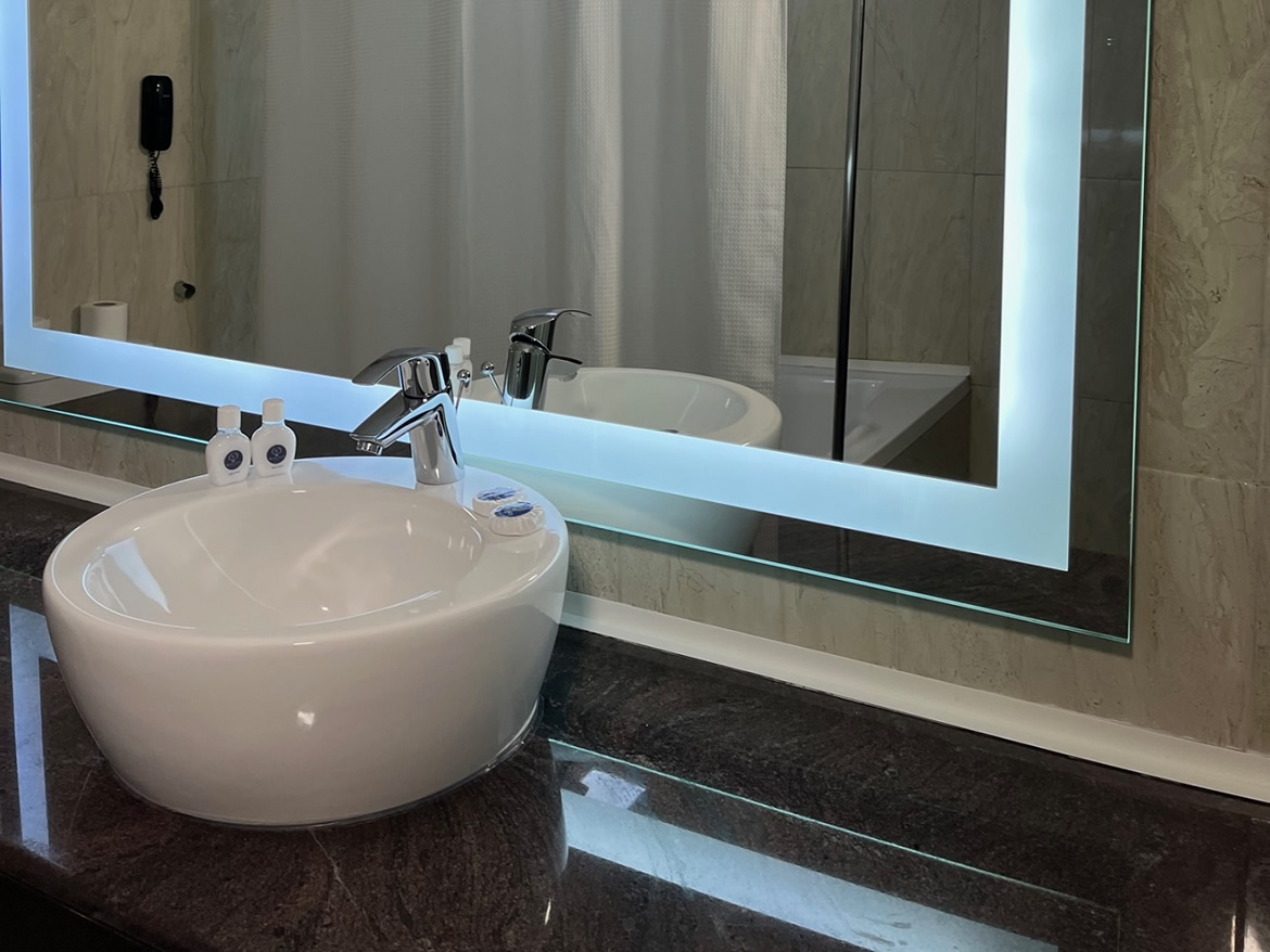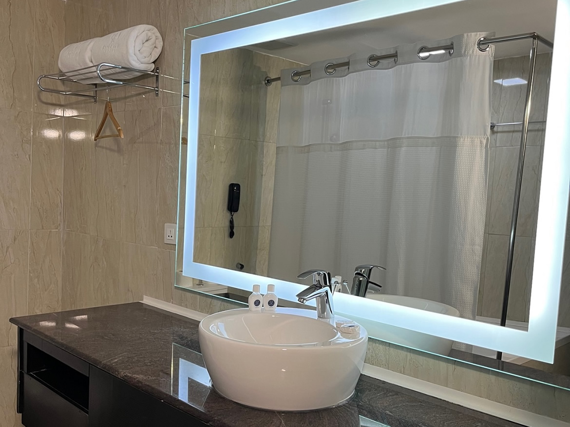 Each bathroom has a 72inch LED mirrors that glows the reflection of your full image. Just click on the menu bar and see all the amazing luxury amenities that each room comes with to make you comfortable as you stay with us. …..